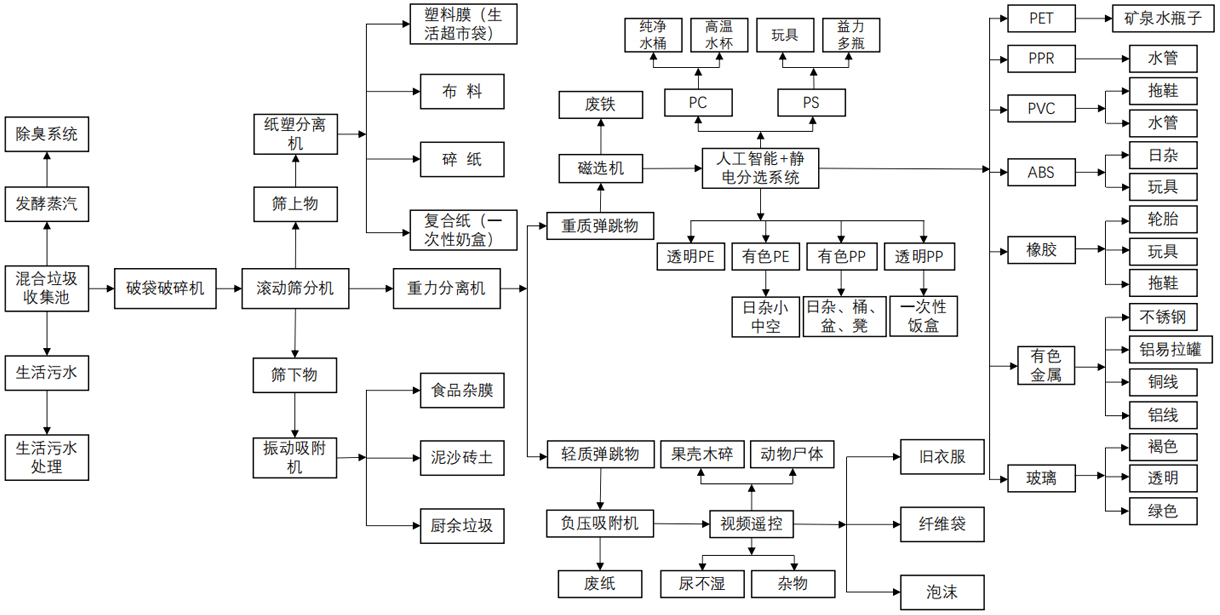 在轻质物料分离后的重质混合物进入重力分离系统,在重力与反向摩擦力的平衡作用下把衣服、包装袋、纸皮、果皮等分离出来。