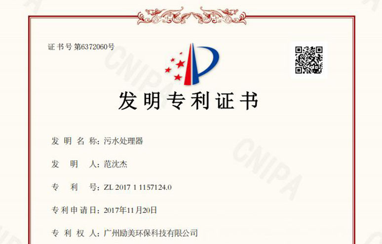 日前,广州励美环保科技有限公司申请的“一种具有混合功能的生活污水处理用收集池”和“污水处理器”两项发明专利,获得国家知识产权局下发的发明专利证书。这两项发明专利的...
